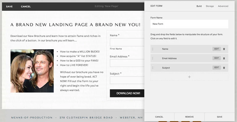 Every Form Block must include a storage option—where captured data will be housed. You can choose a single or multiple storage options. Select the “Storage” button within the Form Block's “Edit Form” menu. You can gather the data into a Google Docs or MailChimp account, or enter an email address where submissions will be corralled.